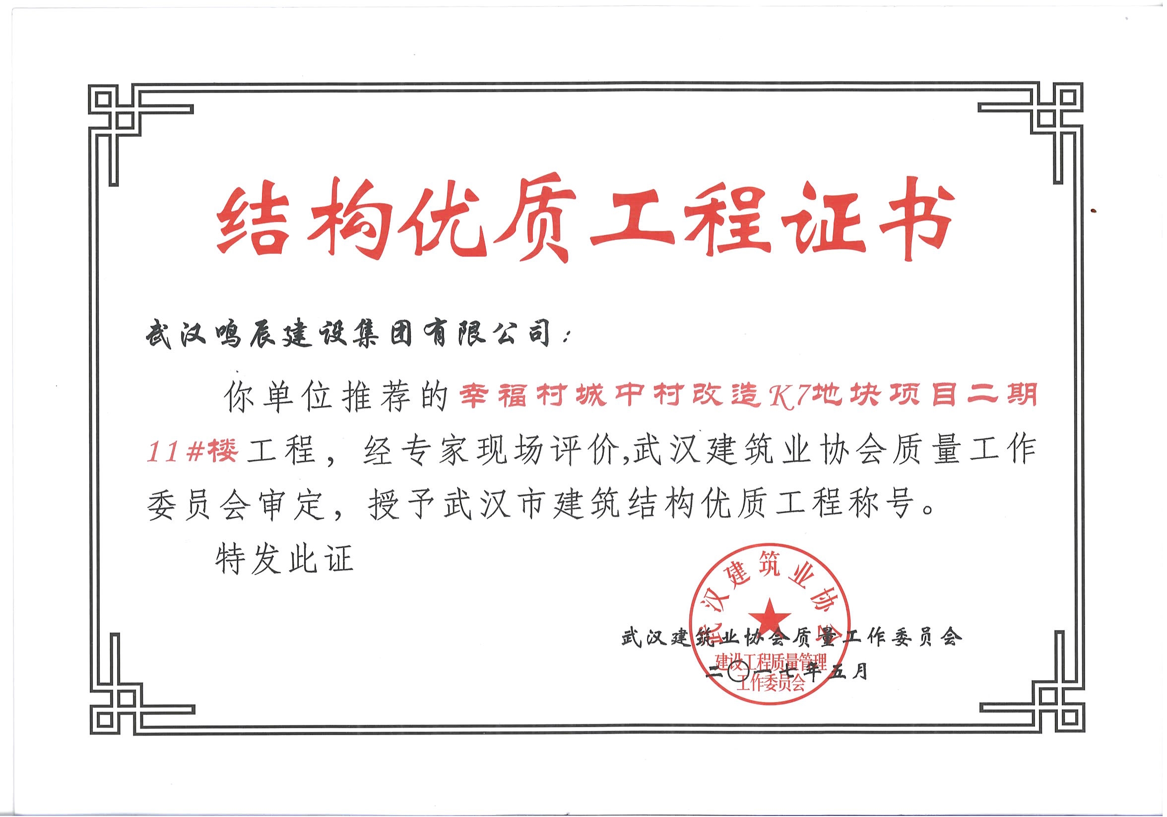 幸福村城中村改造K7地塊項(xiàng)目二期11#樓榮獲武漢市結(jié)構(gòu)優(yōu)質(zhì)榮譽(yù)