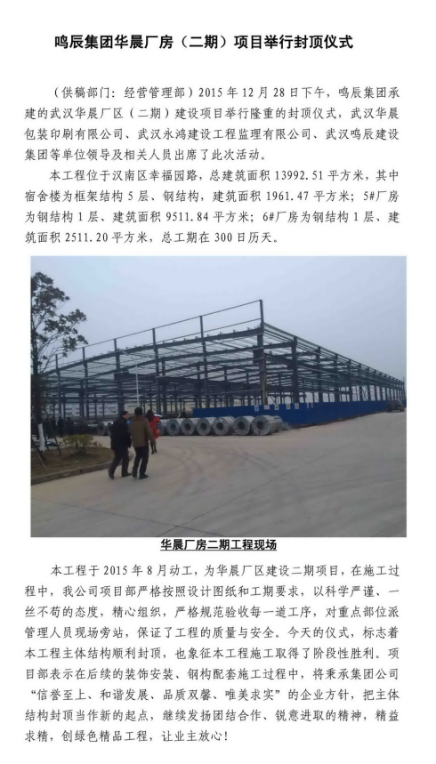 鳴辰集團(tuán)華晨廠房(二期)項(xiàng)目舉行封頂儀式