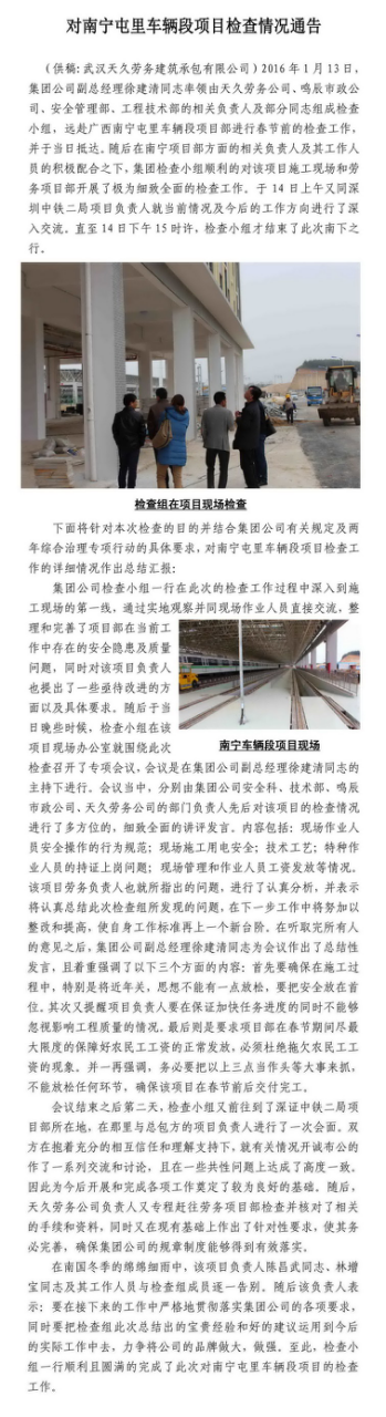 對南寧屯里車輛段項(xiàng)目檢查情況通告